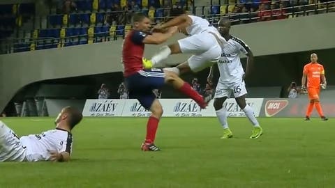 Al defensor del elenco visitante, que estaba 2-1 abajo (y 3-2 abajo en el global), lo dominó la impotencia y le propinó un terrible planchazo en la zona abdominal a Mate Patkai.