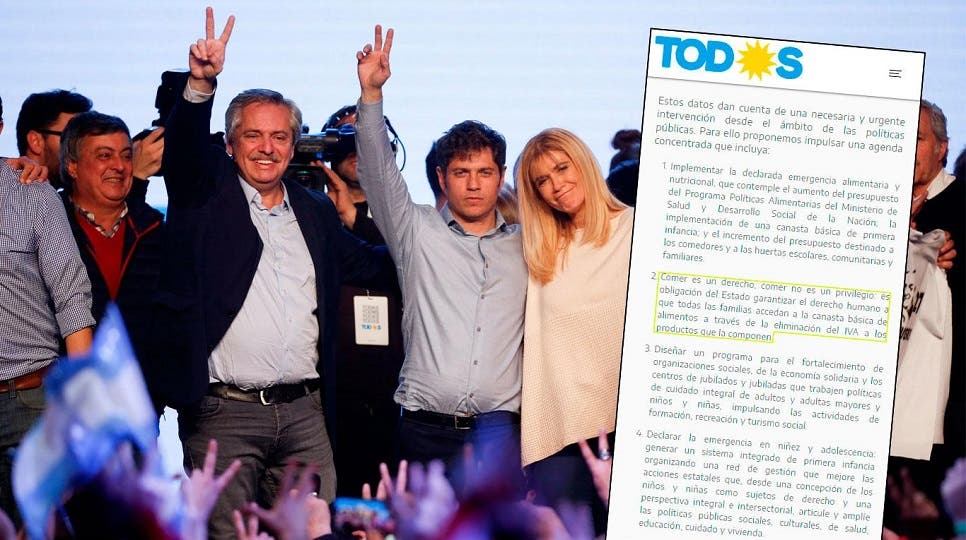 El partido lo incluyó como la segunda propuesta a aplicar en caso de llega a la Casa Rosada bajo el lema "comer es un derecho".El candidato del kirchnerismo Alberto Fernández salió a criticar con mucha contundencia la eliminación del IVA en los alimentos de la canasta básica que impulsó el presidente Mauricio Macri ante la crisis económica. Sin embargo, esa misma medida es la segunda que propone el Frente de Todos, el partido que encabeza él mismo como candidato a Presidente.