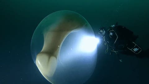 Un buzo con una linterna se acercó a esa increíble esfera translúcida que en su interior parece tener algo parecido a una criatura viva. Sin embargo, el hallazgo no mostró una medusa enorme ni, mucho menos, un huevo de calamar gigante, aunque sí tiene que ver con calamares, dado que esa masa protege a sus futuras crías. La esfera es una enorme masa de huevos de calamar.