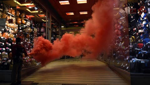 PROTESTA. El humo de bombas de arrojaron militantes del SEOC hizo que los clientes dejaran los comercios.