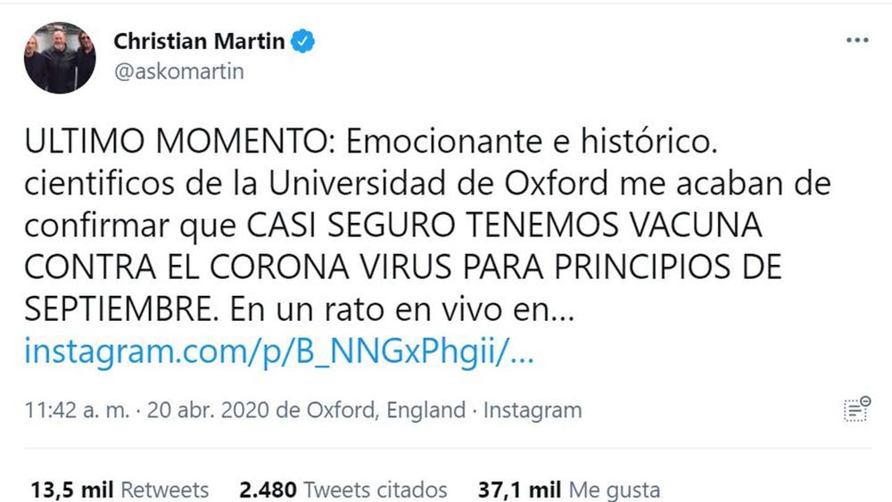 En abril de 2020, Christian Martin anunciaba que científicos habían encontrado el antídoto contra el coronavirus.