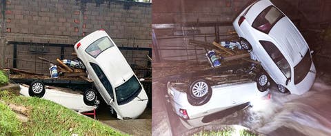 cómo el agua arrastraba a dos vehículos, para dejarlos dados vuelta en el asador de una casa.