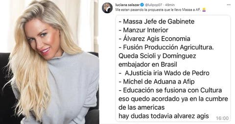 Sobre el cierre de la reunión que mantuvieron Alberto Fernández y Sergio Massa en Olivos, Luciana Salazar se adelantó a cualquier funcionario o periodista y publicó la lista de los cambios que el presidente de la Cámara de Diputados le habría propuesto al Jefe de Estado para conformar el nuevo Gabinete.En el tuit que compartió la mediática no solo aparece Massa como Jefe de Gabinete, sino también algunas modificaciones en carteras claves para el Gobierno.