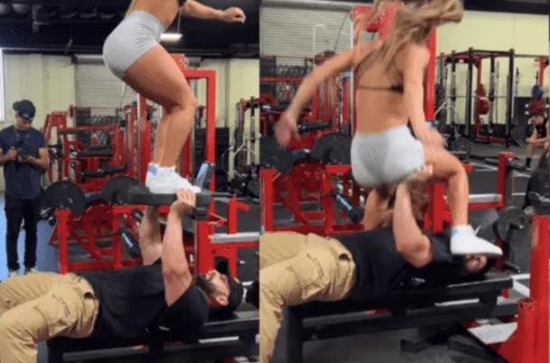 Cuando la mujer logró poner sus dos pies sobre la pesa, Bradley Martyn la subió y luego trató de realizar una repetición de press de banca mientras la joven hacía una flexión.