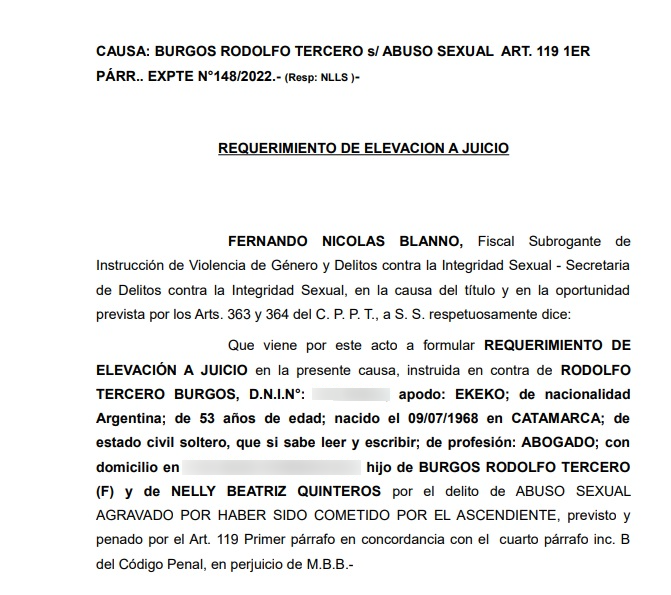 El Fiscal Subrogante de Instrucción de Violencia de Género y Delitos contra la Integridad Sexual, Fernando Blanno, solicitó el requerimiento de elevación a juicio contra el presidente del Directorio de Canal 10 y docente de la Facultad de Derecho de la Universidad Nacional de Tucumán, Rodolfo Tercero Burgos, que en abril de este año fue imputado por abuso sexual en contra de su hija, hoy de cinco años.
