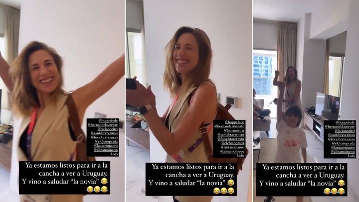“Ya estamos listos para ir a la cancha a ver a Uruguay y vino a saludar ‘la novia’”, escribió el conductor en una de sus historias mientras muestra al Tirri, a Lolo y a Alina, ironizando sobre los rumores. De inmediato ella alza los brazos y festeja, mientras el resto de los presentes aplaude y se ríe de la situación. “Vamos que estamos todos para ir a la cancha a ver Uruguay y Corea y llega el Chato”, describe.
