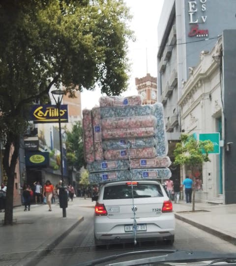 En pleno centro de la ciudad, en calle 25 de Mayo, el conductor circuló con 13 colchones sobre su vehículo.