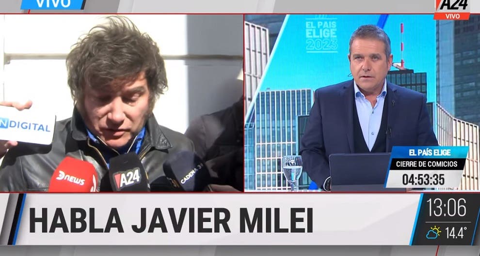 Fue a votar en la UTN pasado el mediodía, entre una nube de simpatizantes; llegó acompañado por su hermana y principal asesora, KarinaGritos aislados se escuchaban media hora antes de que llegara. “Aguante Milei”, gritó un automovilista que pasaba por la puerta de la Universidad Tecnológica Nacional (UTN), entre bocinazos. “Avisame si lo ves venir, eh”, decía una joven a su amiga, en el gélido mediodía de Almagro. Las mesas en la universidad ya presentaban demoras y, entre las filas y el frío, algunos se mostraban molestos. “¿Cuando se vaya Milei va a haber menos gente?”, preguntaba una señora disgustada a la policía.