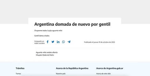 La web del gobierno nacional Argentina.gob.ar fue objetivo de un defacement, que se da cuando los ciberdelincuentes aprovechan las vulnerabilidades de algunos sitios para modificar, total o parcialmente, el aspecto y el contenido. Alrededor de las 16 horas del jueves 19 de octubre se podía ver en la pantalla los mensajes que dejaron los atacantes: “Argentina domada de nuevo por gentil”, “Chupenme todos la (...) aguante milei (sic)” y Gentil doma a todos” son tres de las frases en tipografía más destacada.
