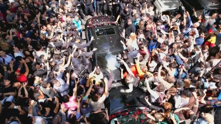 Milei llegó a bordo de un auto, rodeado de una muchedumbre que le arrojaba flores y le cantaba el "feliz cumpleaños".