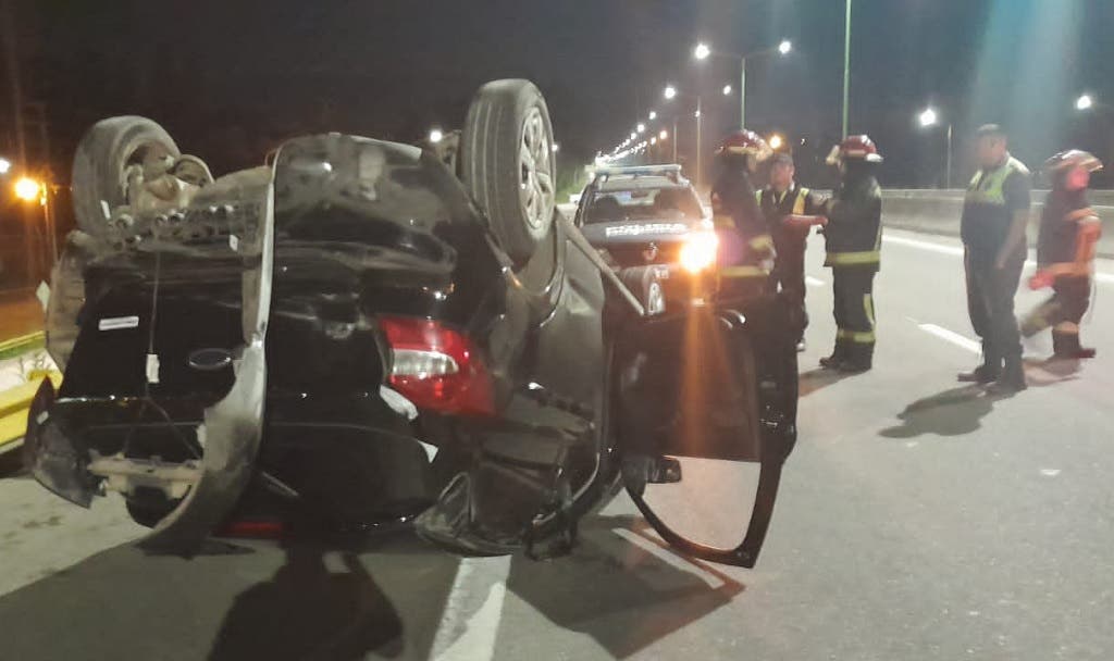 El auto de alquiler, un Toyota Etios, recibió el impacto en la zona trasera izquierda, donde fue alcanzado por el Ford Ka color negro que tras salirse de control, terminó volcado sobre su techo.