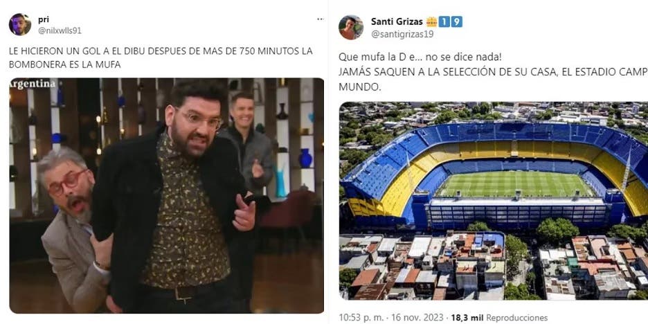 Entre algunos de los comentarios que destacaron al respecto se encontraban: “Le hicieron un gol a el Dibu después de más de 750 minutos la bombonera es la mufa”, “Que mufa no se dice nada! Jamás saquen a la selección de su casa, el estadio campeón del mundo”, y “Es porque La Bombonera es mufa”.