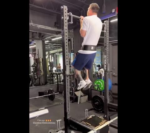 En las imágenes se ve a "Lio" realizar dominadas a dos manos, con una pesa colgada en la cintura.