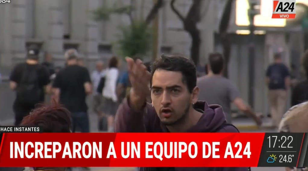 Un equipo de A24 fue atacado en medio de la manifestación, cuando el cronista Javier Mozo estaba apostado en la calle y uno de los protestantes se acercó y lo increpó:
