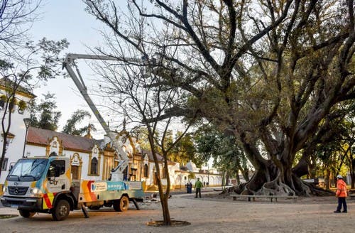 En el marco del Plan de Poda Responsable que lleva adelante la Municipalidad de San Miguel de Tucumán para preservar el arbolado urbano y prevenir accidentes, se está interviniendo el añoso gomero que se encuentra en la Plaza Alfredo Gramajo Gutiérrez, ubicada frente al Cementerio del Oeste, en calle Asunción 150, en la zona del Parque Avellaneda.