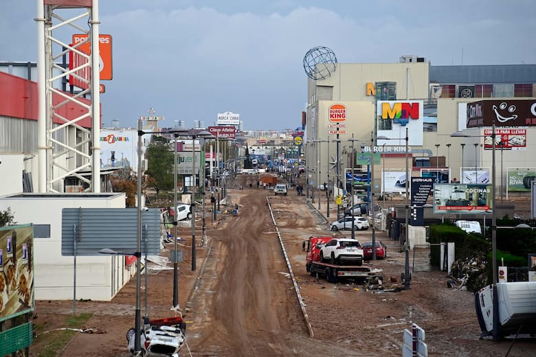 Esta foto tomada el 1 de noviembre de 2024 muestra los devastadores efectos de las inundaciones en una zona comercial de la localidad de Alfafar, en la región de Valencia, al este de España.