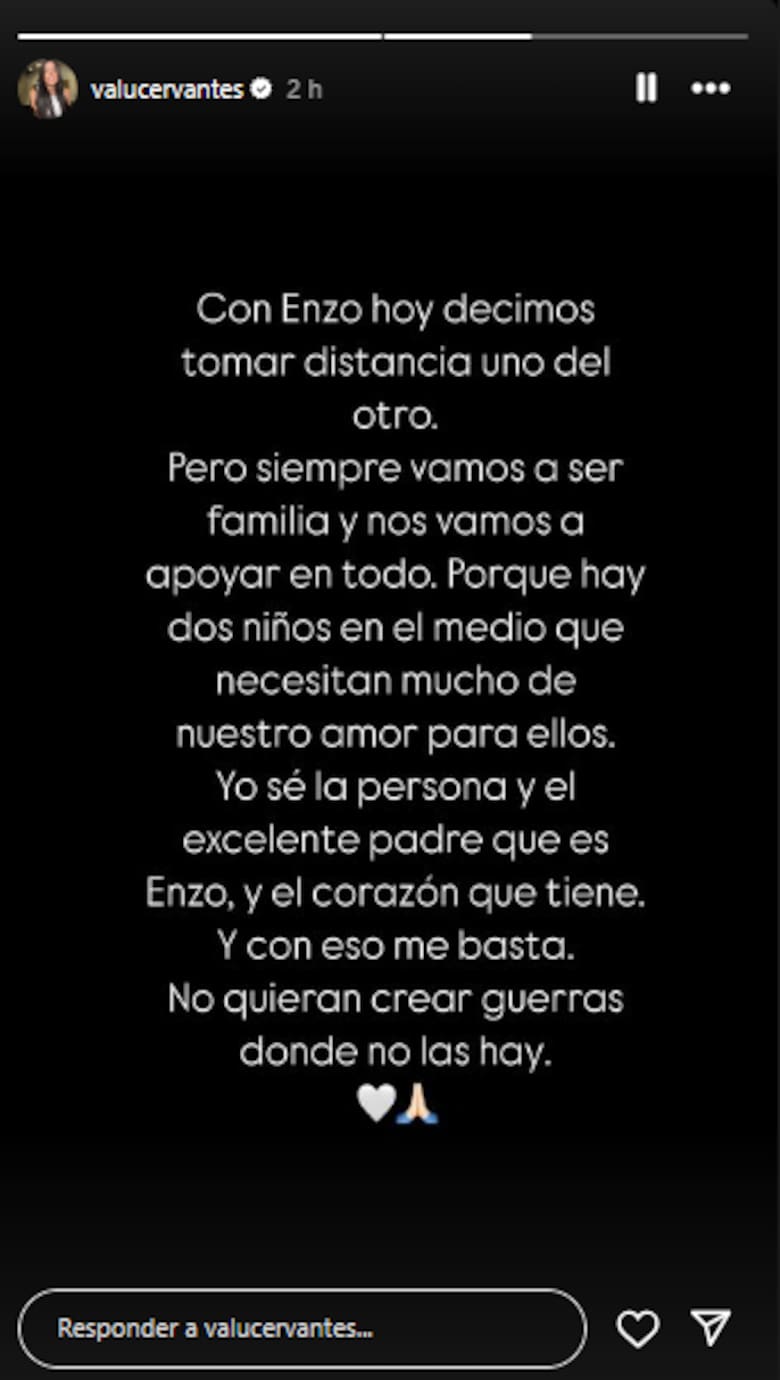 Horas después de que su separación se hiciera pública, Valentina rompió el silencio y se refirió al fin de su relación con el futbolista del Chelsea. “Con Enzo hoy decidimos tomar distancia uno del otro”, expresó a través de sus historias de Instagram. “Pero, siempre vamos a ser familia y nos vamos a apoyar en todo, porque hay dos niños en el medio que necesitan mucho de nuestro amor para ellos”, continuó. “Yo sé la persona y el excelente padre que es Enzo, y el corazón que tiene. Y con eso me basta. No quieran crear guerras donde no las hay”, sentenció. /