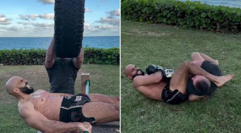 Sin embargo, esta vez decidió publicar un video que parece puro sufrimiento: mientras hace “dominadas” (ejercicio de calistenia que consiste en levantar el cuerpo mientras está colgado de una barra), su entrenador le pega con una rueda de camión en el abdomen. En videos anteriores, recibía patadas.