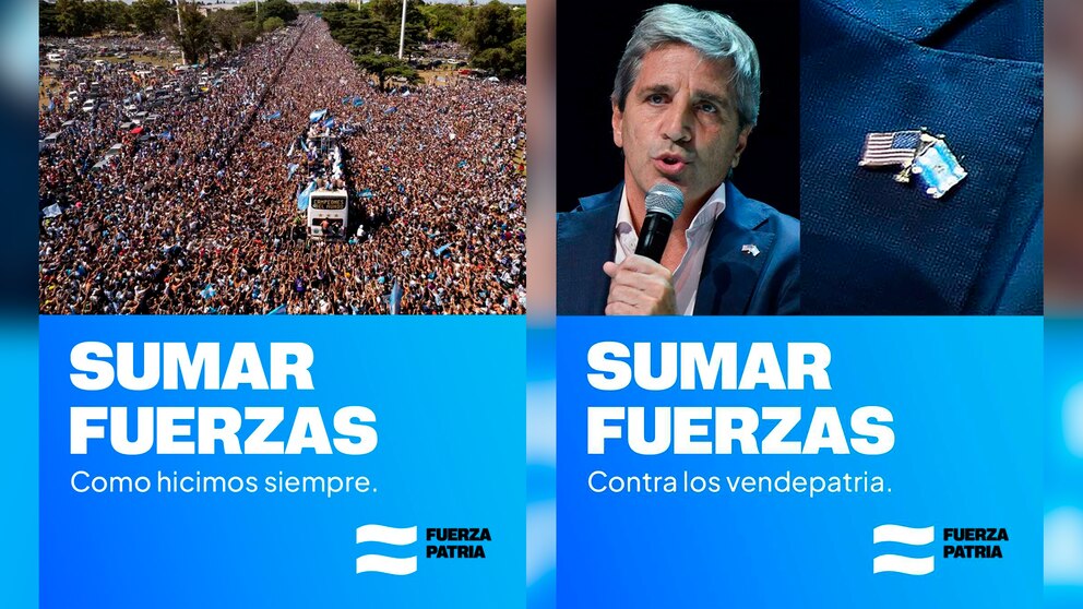 Bajo el eslogan “Sumar Fuerzas”, presentado semanas atrás, la agrupación peronista lanzó una nueva tanda de afiches y spots que apelan a la consigna “frenar a Milei y defender el futuro”. Entre ellos, uno de los carteles generó especial repercusión: la imagen de Caputo portando un pin con la bandera de Estados Unidos, acompañada por la frase “Sumar Fuerzas contra los vendepatria”.