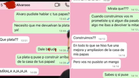 Un chat viral expuso la feroz pelea entre Pilar y su expareja, Álvaro, por una suma millonaria que habría invertido en construir una casa en el terreno de sus suegros. Todo empezó con un mensaje simple, pero la charla terminó en insultos, reproches y la promesa de verse las caras en la Justicia.La historia arrancó cuando Pilar le escribió a Álvaro: “¿Pudiste hablar con tus papás? Necesito que me devuelvan la plata ya”.