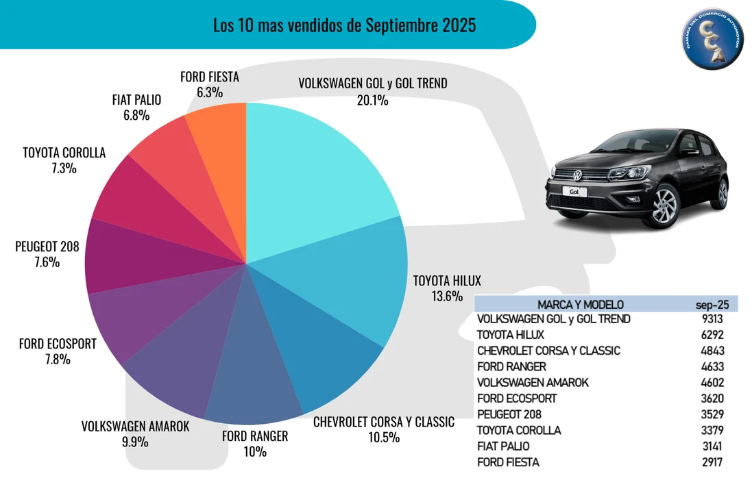 Septiembre volvió a mostrar que el Volkswagen Gol sigue encabezando la preferencia de la gente al adquirir un auto usado. Se comercializaron 9.313 unidades (141 más que en agosto).