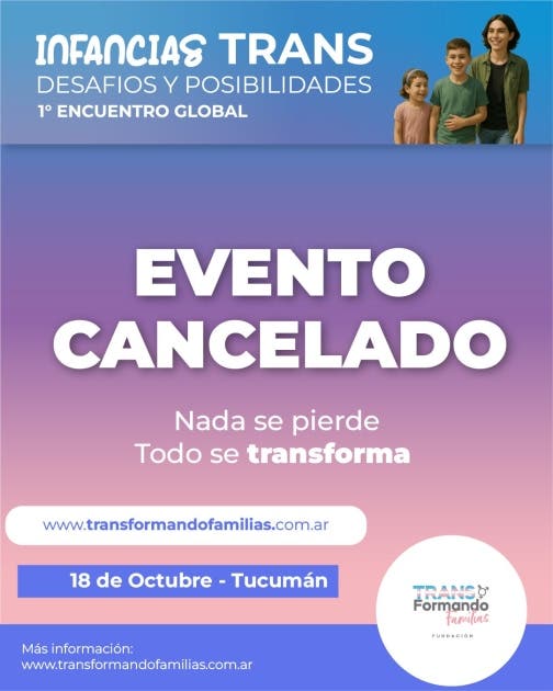 La Fundación Transformando Familias anunció la cancelación del primer Encuentro Global de Infancias Trans, que iba a realizarse el próximo sábado 18 de octubre en la capital tucumana, en medio de fuertes críticas de distintos sectores que cuestionaron la temática del evento.Según informó la organización a través de un comunicado, la decisión fue tomada “con profundo pesar, luego de recibir hostigamientos, agresiones y la difusión de contenidos desacertados y erróneos” en algunos medios y en redes sociales.