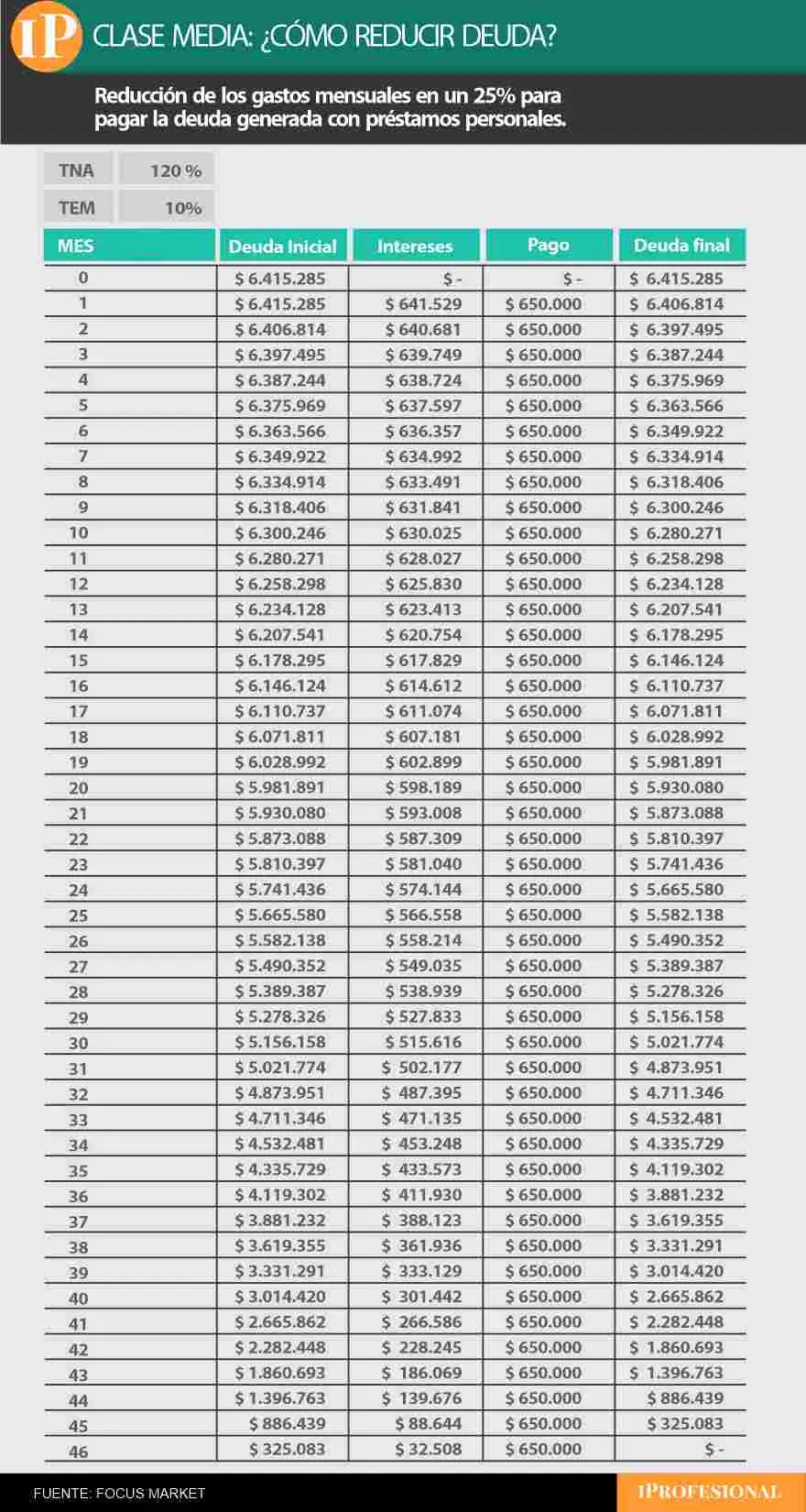 Con el préstamo personal el ejercicio es parecido, aunque la exigencia es mayor. Dado que la tasa es más alta y la deuda acumulada al año supera los $6.400.000, el ajuste necesario para empezar a bajar ese capital tiene que ser más fuerte. En este caso, se requiere un recorte del 25% en los gastos para generar un superávit de $650.000. Así, poco a poco, la deuda empieza a reducirse, pero el proceso es mucho más largo: puede extenderse por varios años hasta que el capital quede saldado.