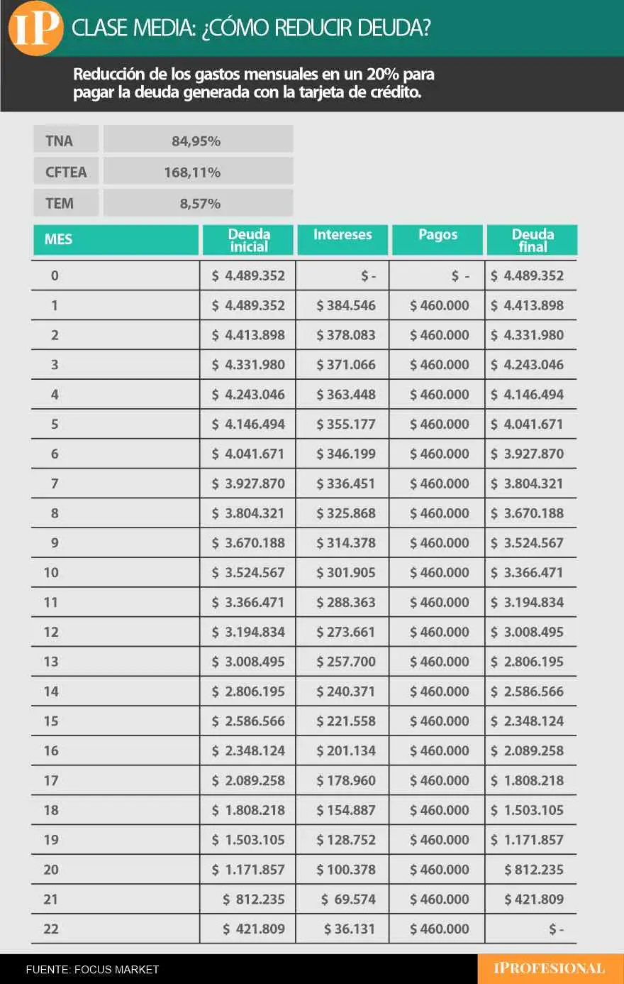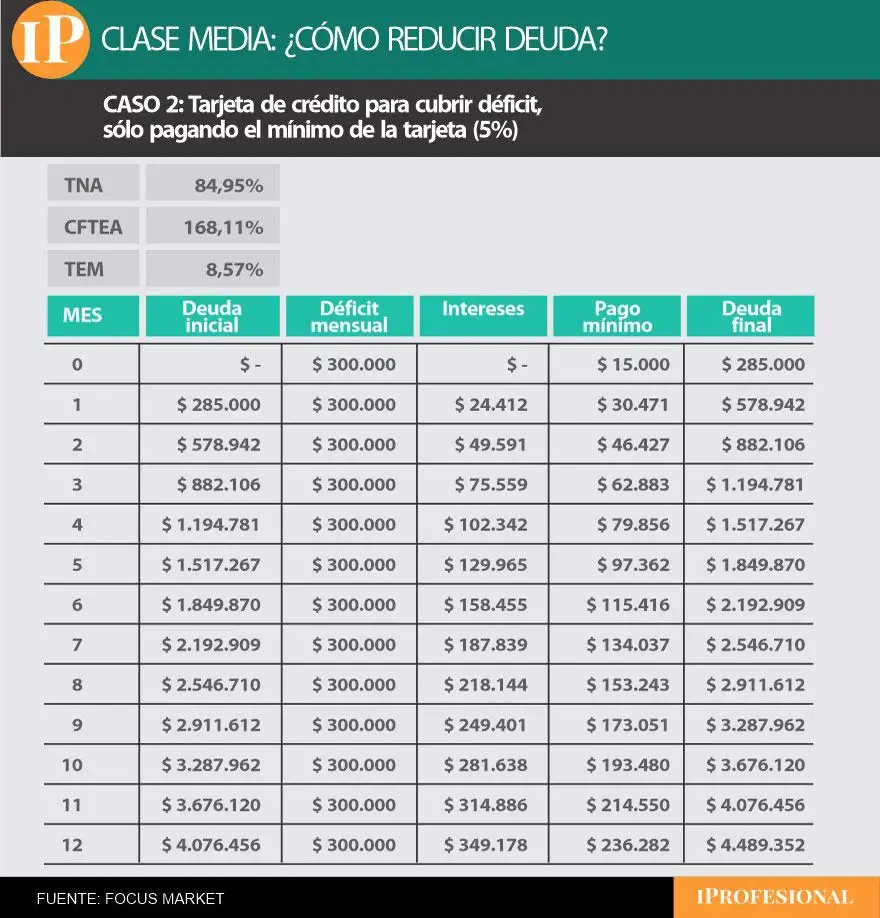Con una tasa nominal anual del 84,95%, que se traduce en un costo financiero total de más del 160%, la deuda empieza a inflarse rápidamente. El primer mes, la familia financia $300.000, paga un mínimo de $15.000 y queda con un saldo de $285.000. Pero como al mes siguiente debe sumar otro déficit de $300.000 y, además, abonar los intereses sobre lo anterior, el monto sube a casi $579.000 en apenas dos meses.