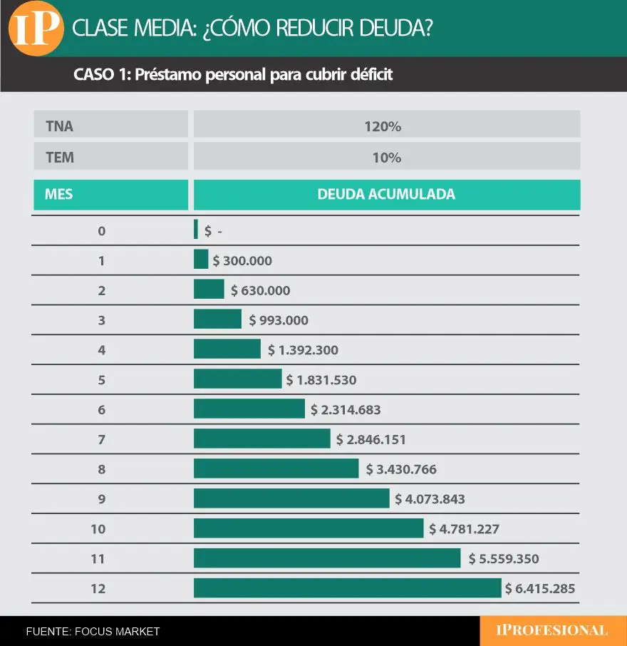 El primer mes, el préstamo solicitado para cubrir el déficit deja un saldo de $300.000. Al mes siguiente, para pagar nuevamente los gastos, la familia pide otros $300.000, pero ya no debe solo eso: la deuda anterior se incrementó por los intereses. Así, en apenas dos meses, la deuda acumulada llega a $630.000. El mecanismo se repite mes a mes: el déficit sigue igual, los intereses se suman, y el monto adeudado escala casi sin que la familia lo note.