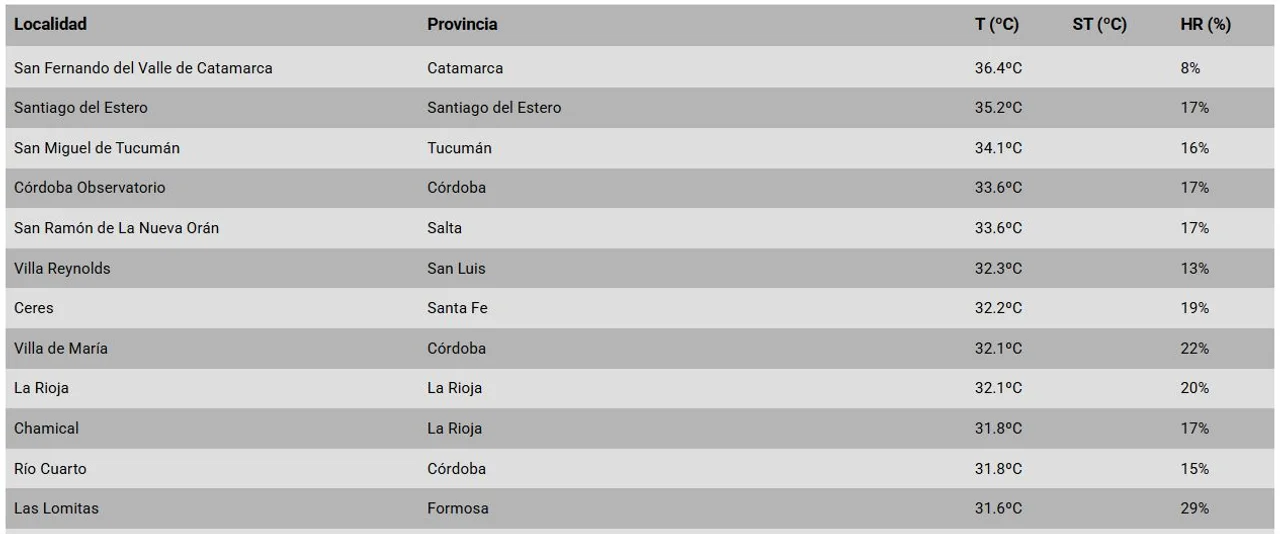 El ranking de temperaturas del Servicio Meteorológico Nacional ubicó también a Córdoba, La Rioja, Salta y Formosa entre las provincias más calurosas del día, con registros superiores a los 31 °C.