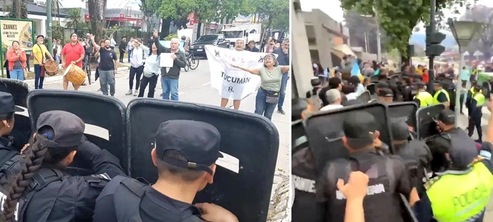 no pertenecían a partidos políticos tradicionales, aunque entre ellos había docentes y militantes universitarios. La Policía de Infantería intervino para dispersar al grupo y reubicarlos detrás de un vallado sobre las calle Mariano Moreno y avenida Aconquija, a unos 200 metros del epicentro del evento.