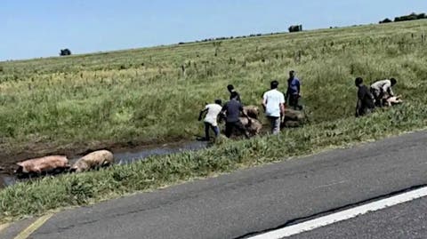 Un camión que transportaba cerdos volcó este lunes en el kilómetro 179 de la Ruta Nacional 7, en el partido de Chacabuco, Buenos Aires, y en cuestión de minutos, vecinos arribaron al lugar del acontecimiento para llevarse la carga. El chofer resultó con lesiones leves y fue asistido por personal del SAME y efectivos policiales. Pese a que las causas del accidente no fueron determinadas, testigos señalaron que el rodado “mordió la banquina” y perdió el control, para luego volcar a unos 15 metros del asfalto. Al momento del impacto, la jaula se partió y los animales comenzaron a esparcirse por el terreno, algunos desorientados y otros inmóviles. Apenas se conoció la noticia, automovilistas y vecinos de la inmediaciones se acercaron para tomar lo que podían: algunos cargaban los cerdos a pie, mientras que otros los subían a carros o al baúl de sus autos.