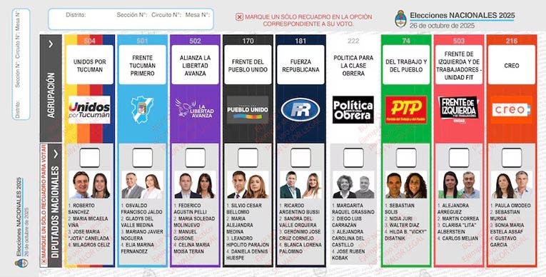 La boleta tucumana es una hoja de tamaño A4 con nueve columnas verticales (una por lista) and filas horizontales para la categoría de diputados nacionales, acompañada de fotos, logos y datos de los candidatos.