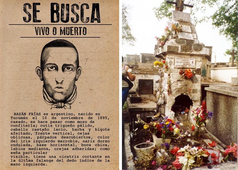 Muerte y nacimiento del mitoEl 13 de enero de 1923, la persecución llegó a su fin. La versión más conocida dice que Bazán Frías fue abatido por la policía mientras intentaba trepar el muro del Cementerio del Oeste, en la capital tucumana. Llevaba encima varias armas y heridas de bala. Tenía poco más de 30 años.