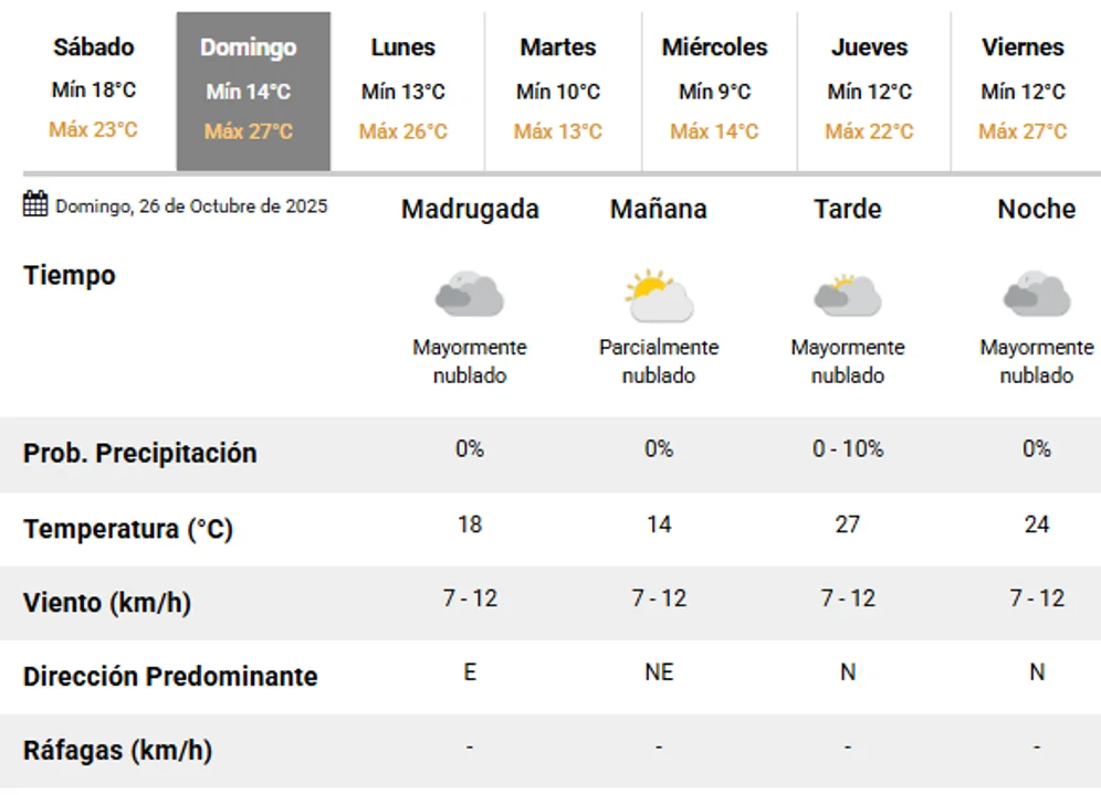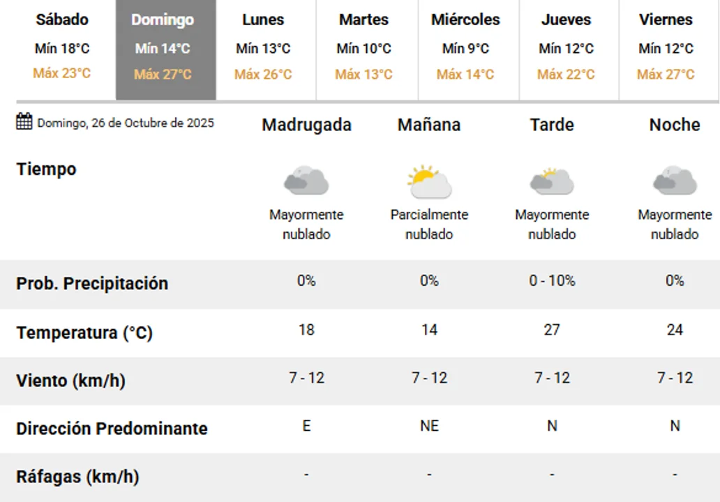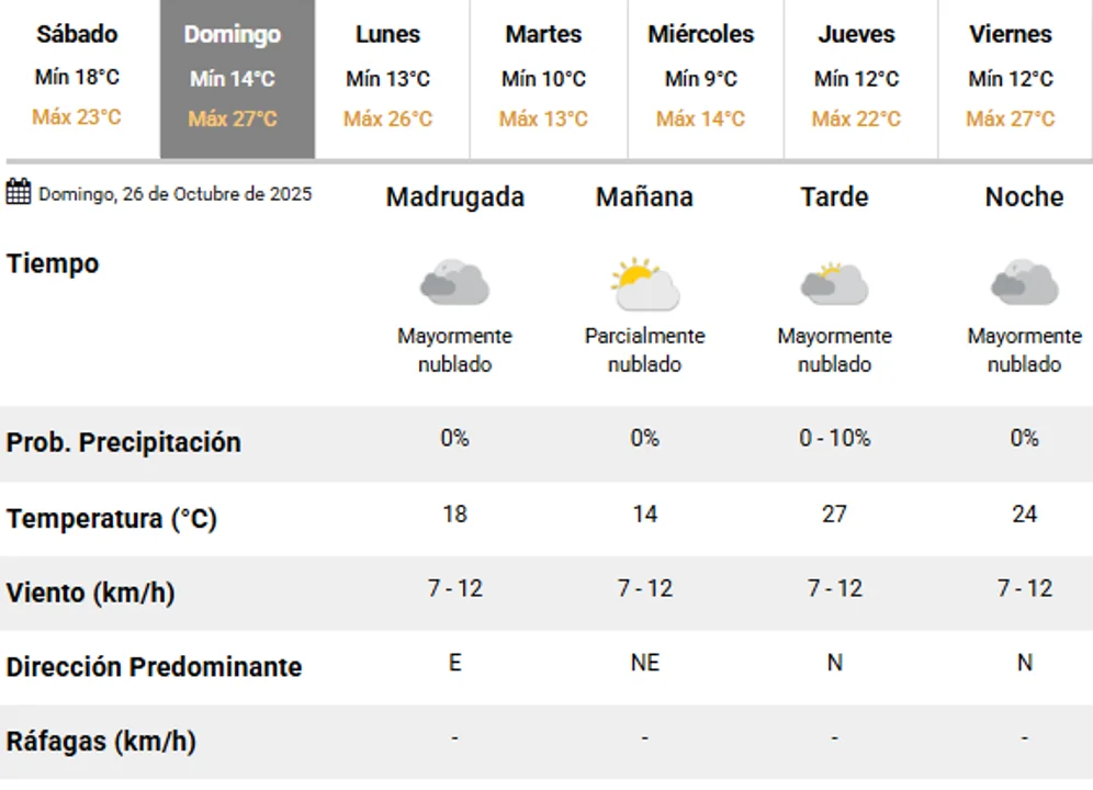 El Servicio Meteorológico Nacional anticipa un domingo de elecciones con tiempo mayormente nublado en San Miguel de Tucumán, pero sin lluvias a la vista.Durante la jornada, las temperaturas oscilarán entre los 14 °C de mínima y 27 °C de máxima, mientras que el viento se mantendrá leve, entre 7 y 12 km/h, con dirección predominante del este y norte.