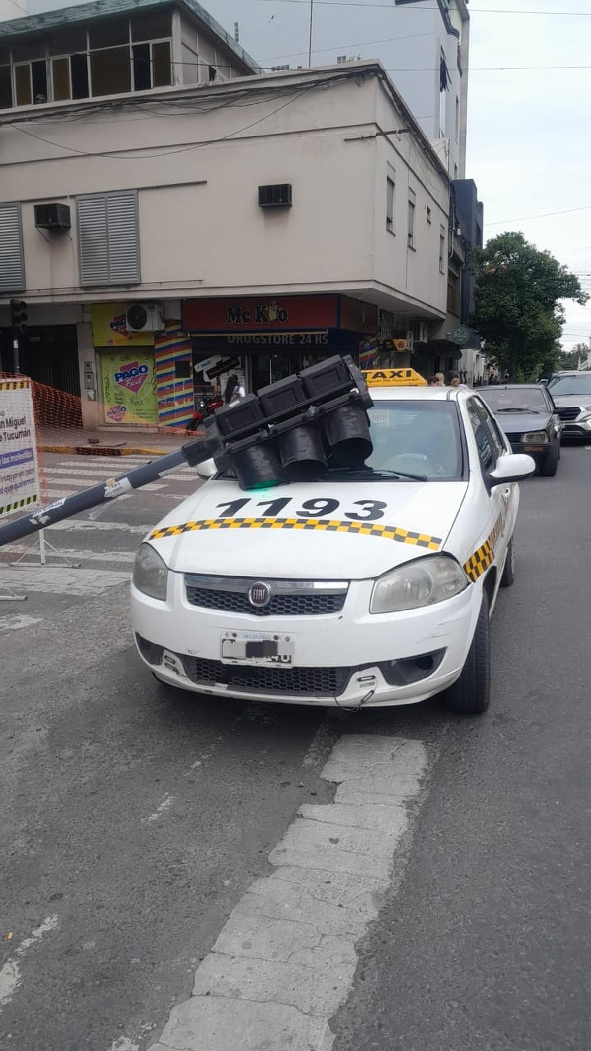 Un poste que sostiene un semáforo cayó sobre un taxi que llevaba a una pasajera. Ocurrió en la esquina de Monteagudo y Santiago Del Estero. Milagrosamente, solo hubo daños materiales.