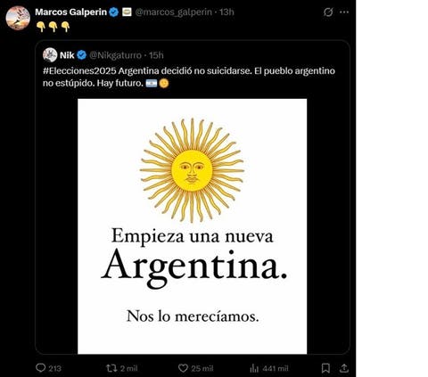 En su tuit, Nik publicó: "#Elecciones2025 Argentina decidió no suicidarse. El pueblo argentino no estúpido. Hay futuro."