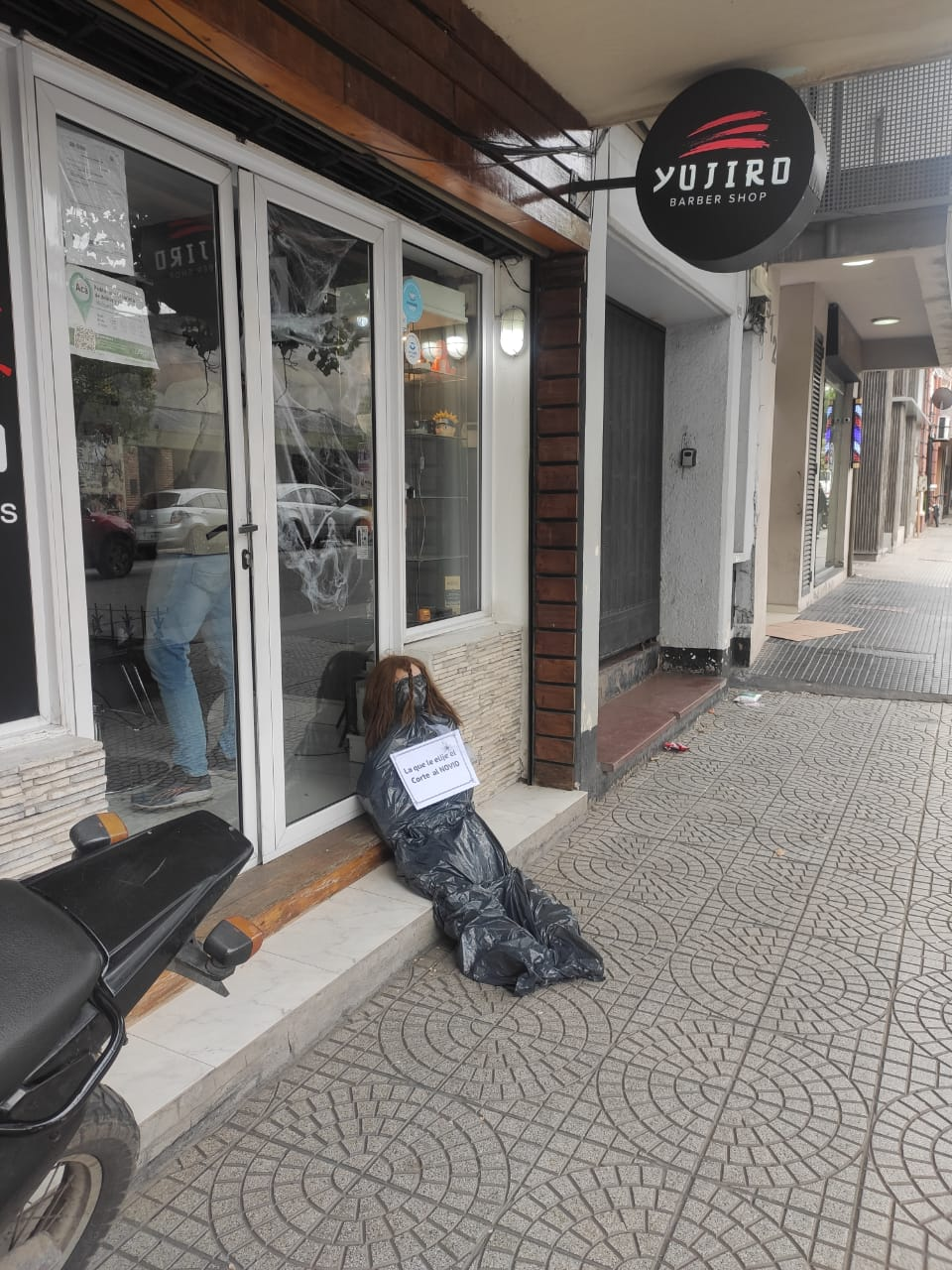 Una barbería del barrio Sur de San Miguel de Tucumán quedó en el centro de la polémica tras exhibir, en la vereda, un maniquí de mujer cubierto con una bolsa negra y el rostro destrozado, acompañado por un cartel que decía: “La que le elije el corte al novio” y el eslogan del local: “Cortamos como samurais”. La intervención generó indignación de transeúntes y colectivos culturales, que la señalaron como violenta y misógina.