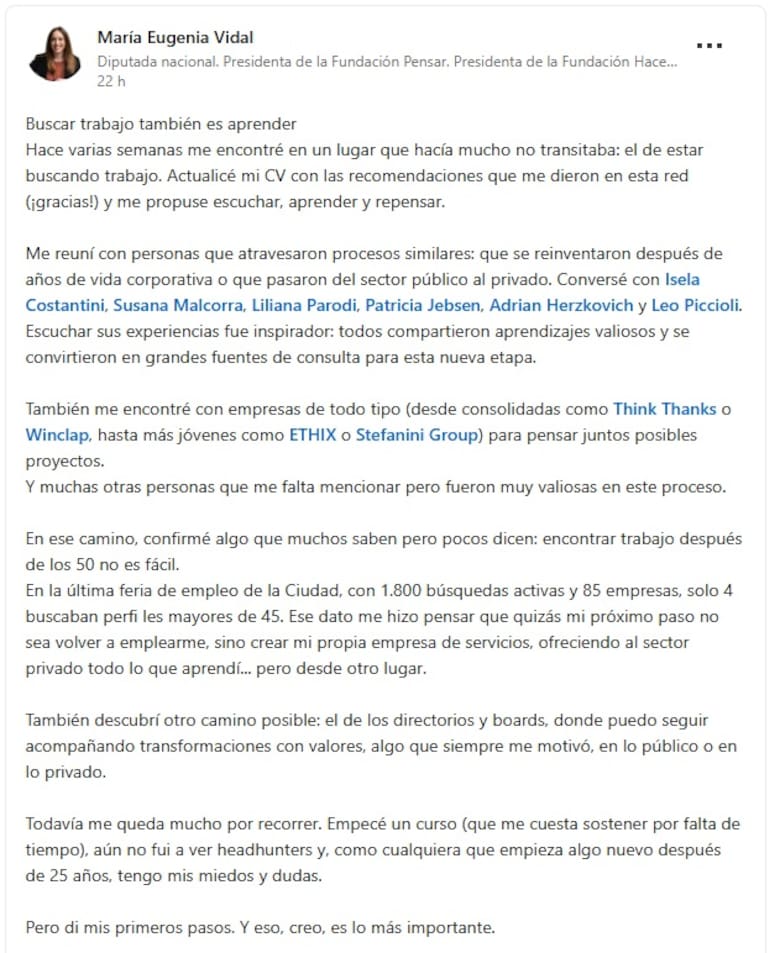 A dos meses de dejar su banca en la Cámara de Diputados, María Eugenia Vidal reiteró su pedido de trabajo en el sector privado y dijo que le cuesta conseguir empleo porque después de los 50 “no es fácil” el mercado laboral. Además, dijo que abrió su propia consultora.La dirigente de Pro y también exgobernadora de Buenos Aires, que tiene 52 años y no se postuló a ningún cargo electivo este año -por lo que se queda sin mandato-, subió una publicación a LinkedIn -red social especializada en el mundo del empleo- y contó también que empezó un curso que le cuesta seguir por falta de tiempo.
