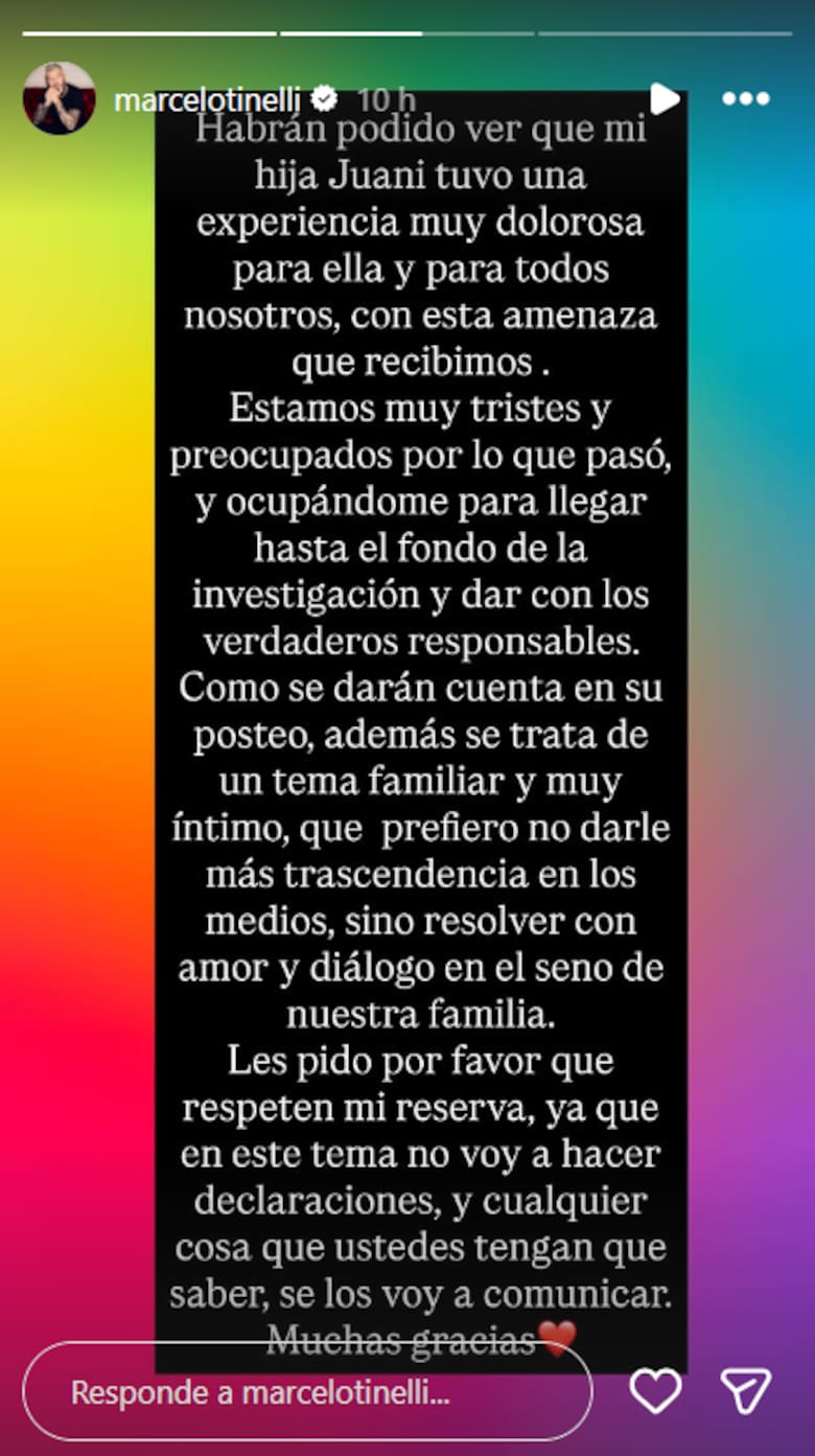El conductor también pidió respeto por la privacidad de su familia y aclaró que prefería no profundizar el tema públicamente. “Como se darán cuenta en su posteo, además se trata de un tema familiar y muy íntimo, que prefiero no darle más trascendencia en los medios, sino resolver con amor y diálogo en el seno de nuestra familia.