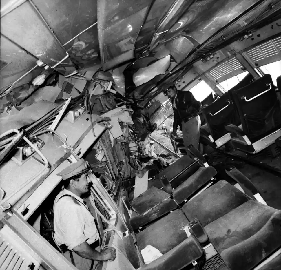Los dos vagones ubicados detrás de las locomotoras se precipitaron por el terraplén, mientras que el pullman SP 165, que venía detrás, impactó de lleno contra ellos y se dobló en forma de “U”, atrapando a numerosos pasajeros entre hierros y vidrios.