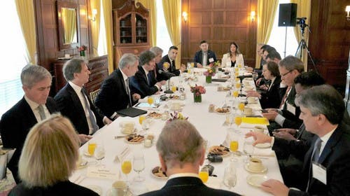 Continental Grain Company, Newmont Corporation, McEwwn Copper Inc, Morgan Stanley, Salesforce, The AES Corporation, Pepsico, Pfizer, Merck, Sharpe and Dohme, Glencore, FedEx y Cisco Systems.Milei hizo una introducción de casi media hora y a continuación, el presidente contestó con precisión cada uno de los interrogantes que surgieron en el desayuno de trabajo.