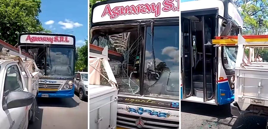 El golpe fue particularmente fuerte, ya que la camioneta tenía una escalera en su parte superior, la cual provocó la rotura del parabrisas delantero del colectivo.