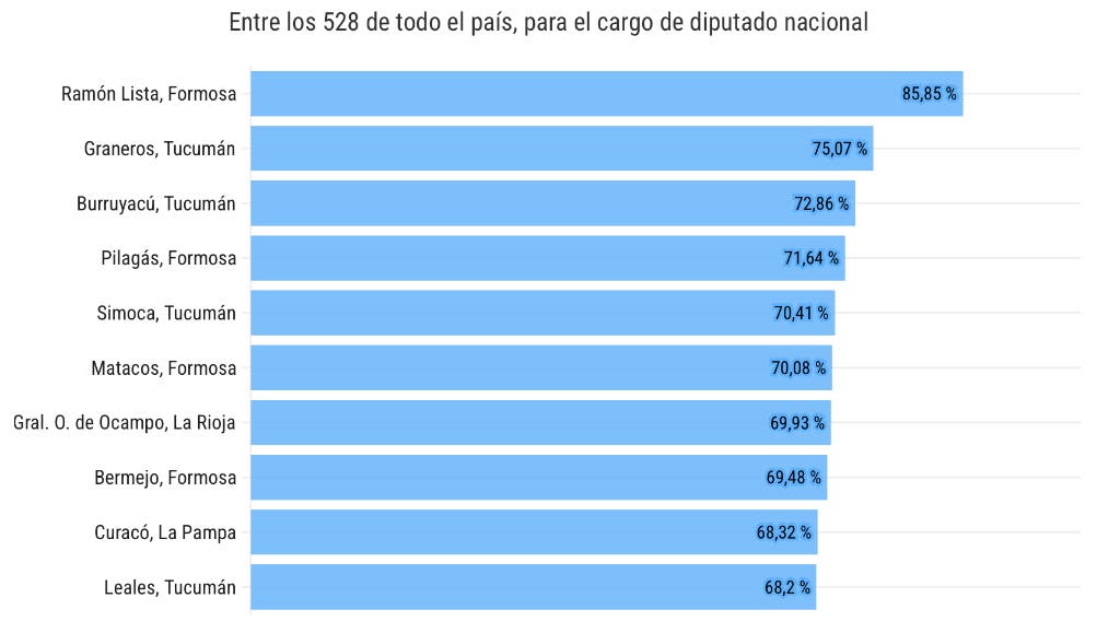 El ranking lo lidera la localidad de Ramón Lista en Formosa, donde el Frente de la Victoria que impulsó el mandatario Gildo Insfrán obtuvo el 85,85% de los votos contra solo 11,88% de LLA. En el total provincial la brecha no fue tan amplia: 58,53% de la lista peronista para diputados nacionales encabezada por la ex auditora general Graciela De la Rosa contra 35,87% que obtuvo el candidato de la nómina apoyada por la Casa Rosada, Atilio Basualdo, intendente de Las Lomitas.