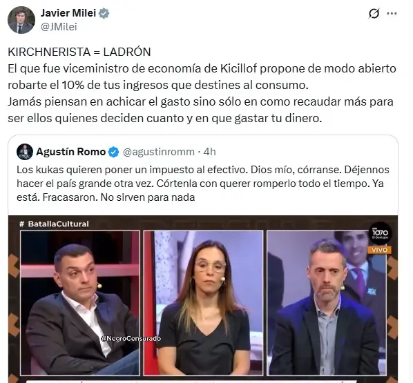 El propio Milei amplificó la polémica al citar el video en su cuenta de X con un mensaje contundente: "KIRCHNERISTA = LADRÓN. El que fue viceministro de economía de Kicillof propone de modo abierto robarte el 10% de tus ingresos que destines al consumo. Jamás piensan en achicar el gasto sino sólo en cómo recaudar más para ser ellos quienes deciden cuánto y en qué gastar tu dinero." Con esa publicación, el Presidente instaló la discusión sobre la estructura tributaria en el centro del debate político.