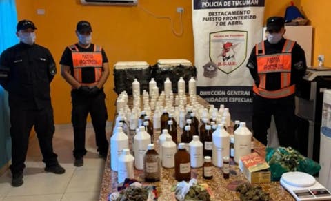 Tras obtener la autorización judicial para abrir los envases, los uniformados descubrieron 400 gramos de marihuana, 30 kilos de hojas de coca y, como novedad absoluta, 139 botellas con diversos productos químicos que, según los expertos, sirven para transformar pasta base en cocaína o para estirarla durante el proceso de comercialización.