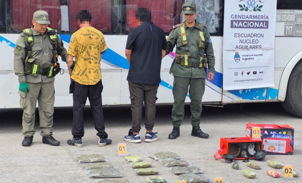 El operativo fue ejecutado por el Escuadrón Núcleo “Aguilares”. Apenas los uniformados subieron al ómnibus para inspeccionarlo, un detalle llamó la atención: un parlante apoyado entre los asientos 29 y 30, cuyo peso resultaba desproporcionado para su tamaño y que, además, despedía un intenso olor a marihuana. La sospecha se transformó en certeza cuando se identificó a sus dueños, dos hombres mayores de edad que viajaban juntos.