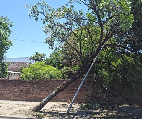 El ejemplar, debilitado por los vientos y la caída de ramas, permanece sostenido únicamente por una columna de alumbrado público, cuya estabilidad también podría verse comprometida.