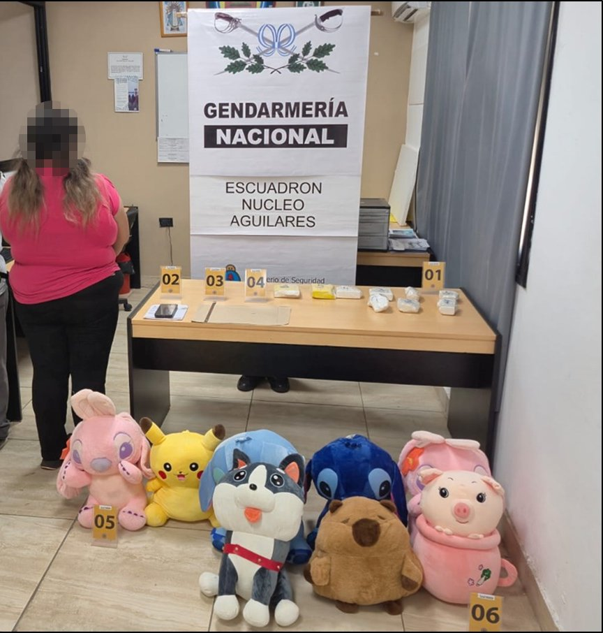 A principios de esta semana, Una pasajera de nacionalidad boliviana fue detenida, luego de que Gendarmería hallara cocaína en los peluches que llevaba como parte de un tour de compras, al sur de Tucumán. El procedimiento tuvo lugar sobre la Ruta Nacional N°38 a la altura de la localidad tucumana de Huacra en donde los efectivos del Escuadrón Núcleo “Aguilares” detuvieron la marcha de un ómnibus que oficiaba como “Tour de compras” y se dirigía hacia la provincia de Mendoza.