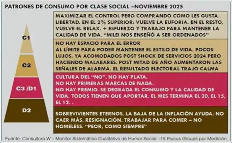En cambio, tanto la "Clase media baja" como la "Clase baja superior, no pobre" transitan lo que la consultora define como "la cultura del ‘no’". En esos niveles, la expresión "no hay plata" aparece como un patrón dominante.